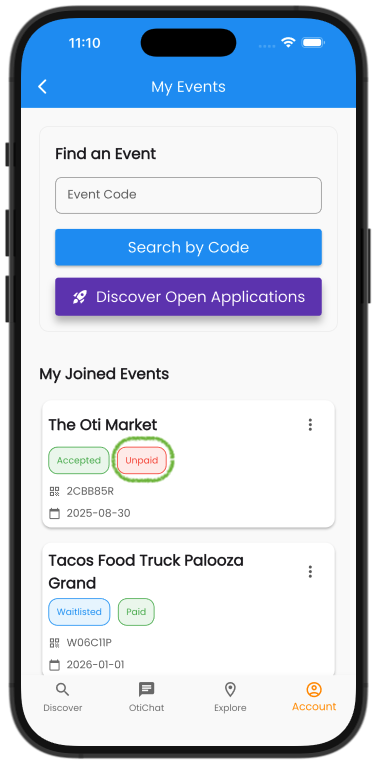 Oti wants you to have a fantastic time out sharing what you make. Part of an event is payments. In this walkthrough we will explore how easy it is to purchase your event vendor pass using Oti.